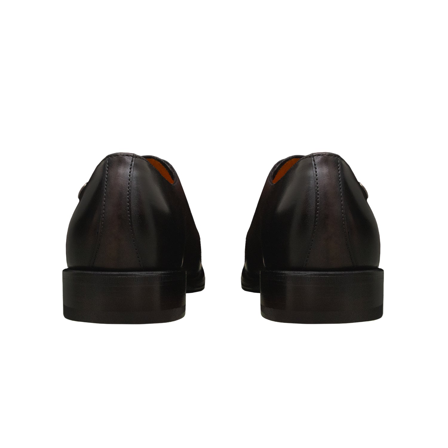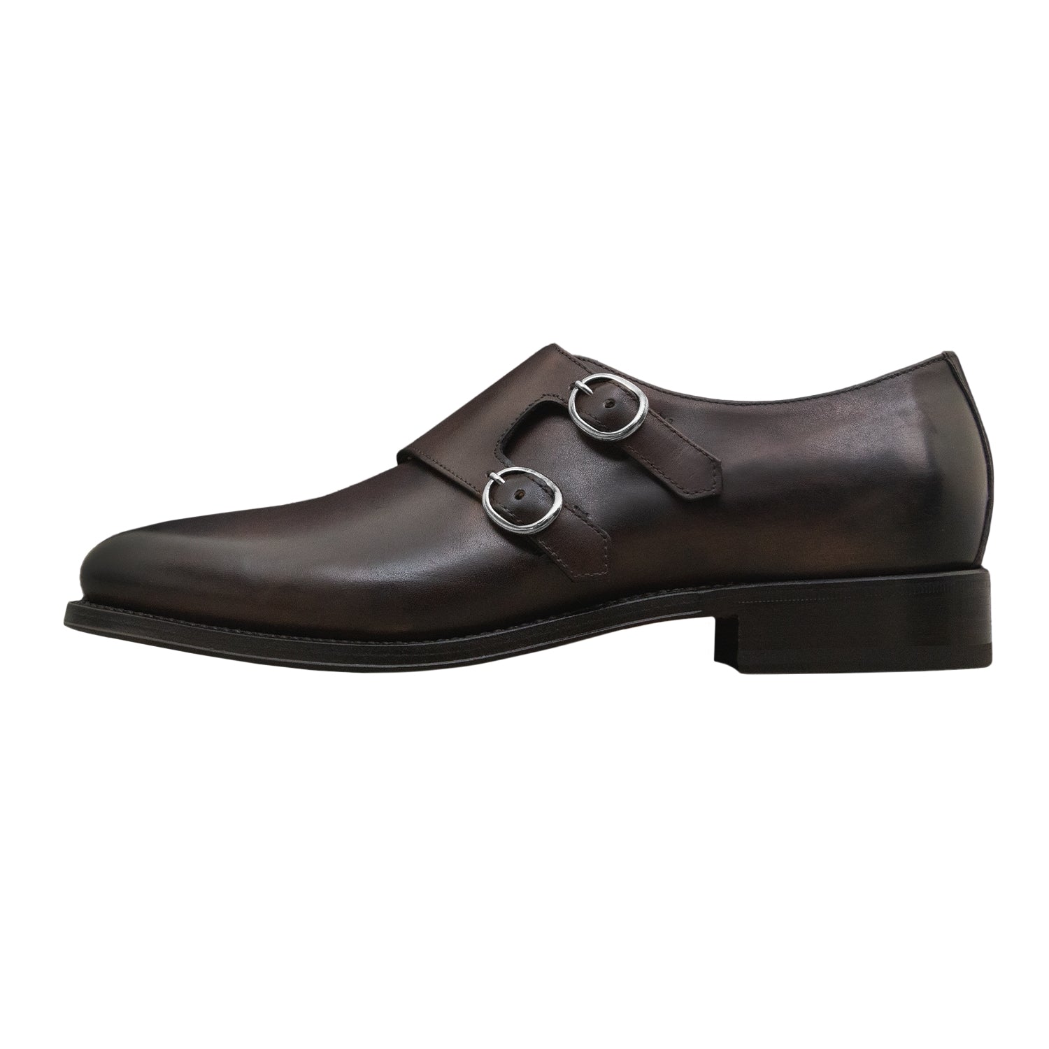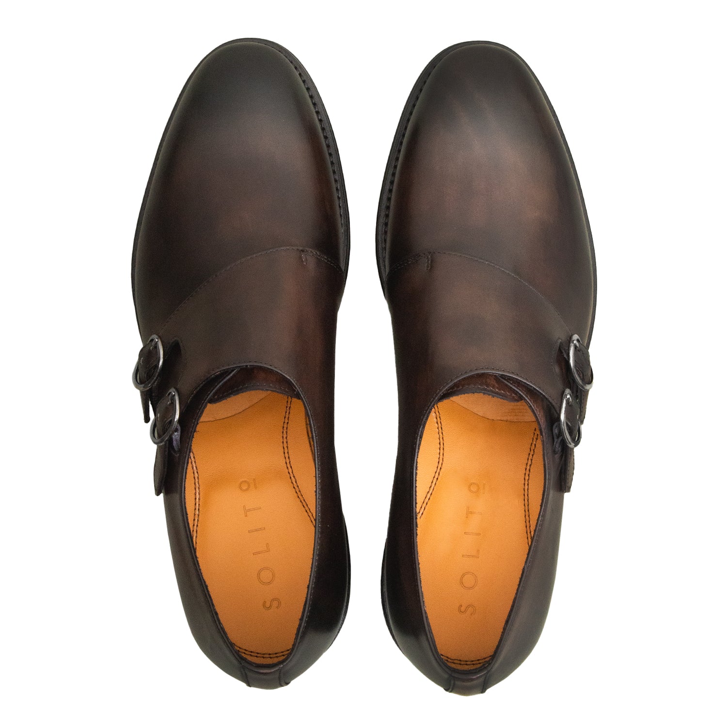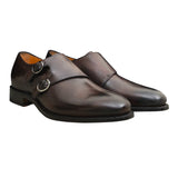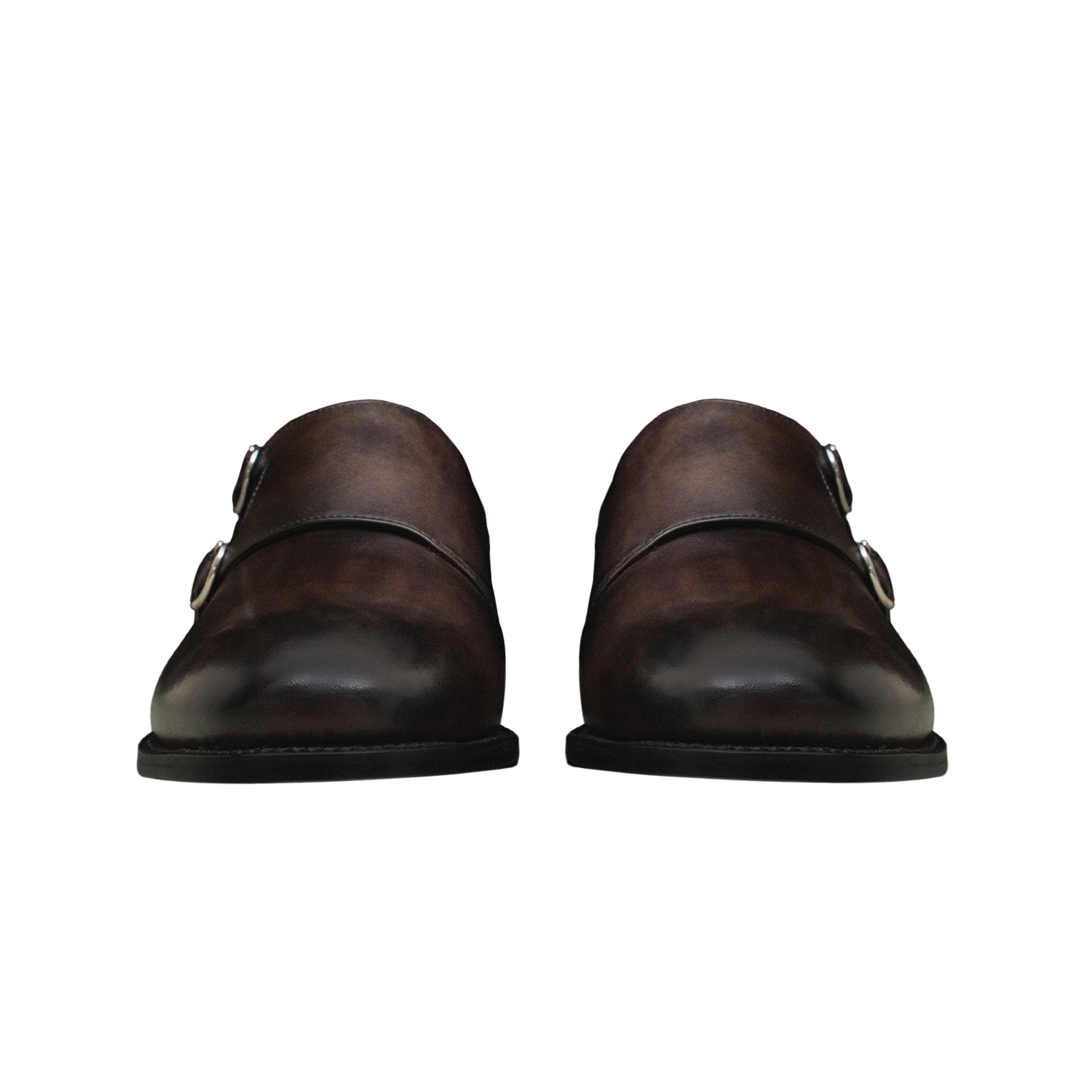 ZAPATO DOUBLE MONK EN CUERO CON PÁTINA A MANO EN COLOR CAFÉ
